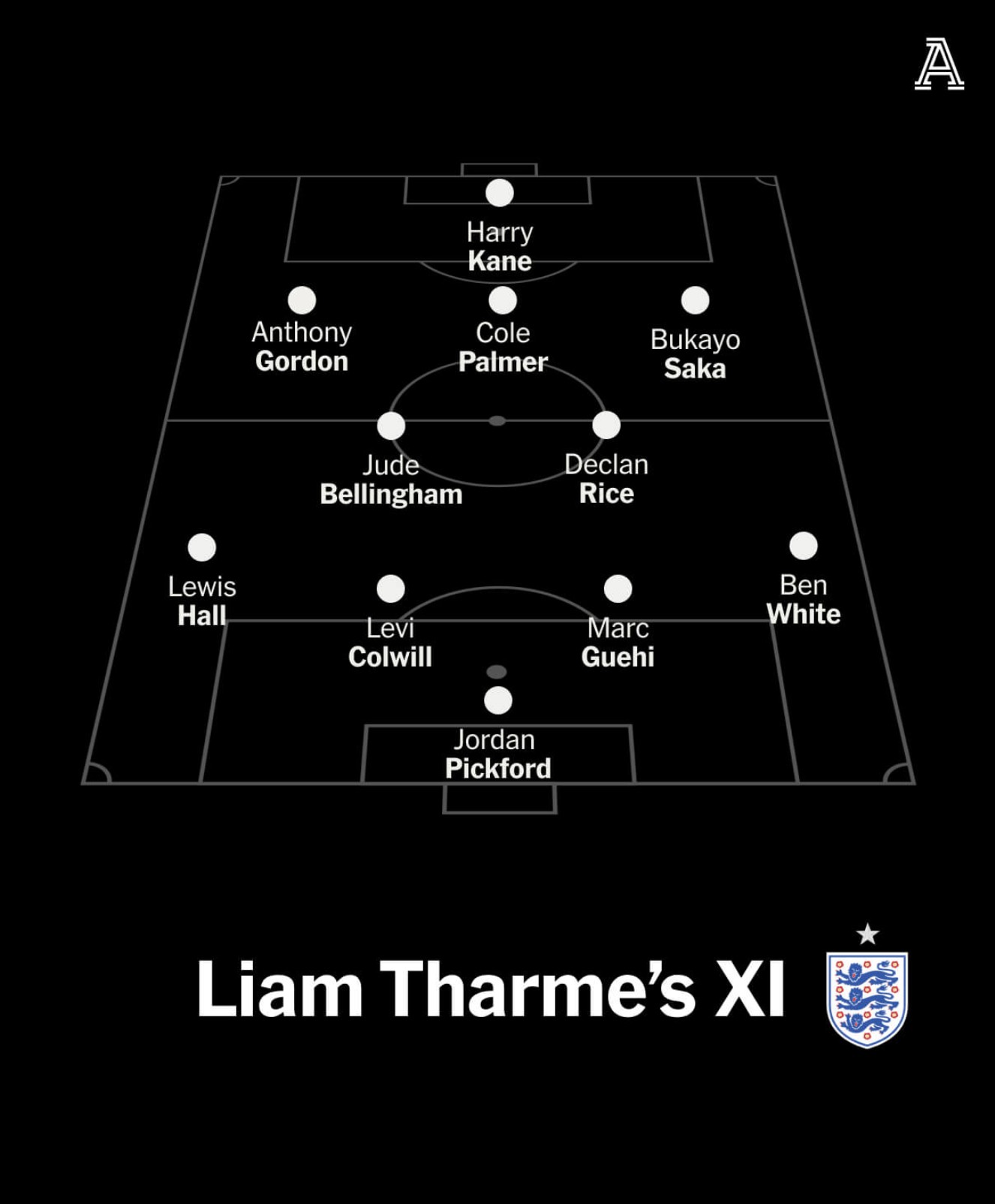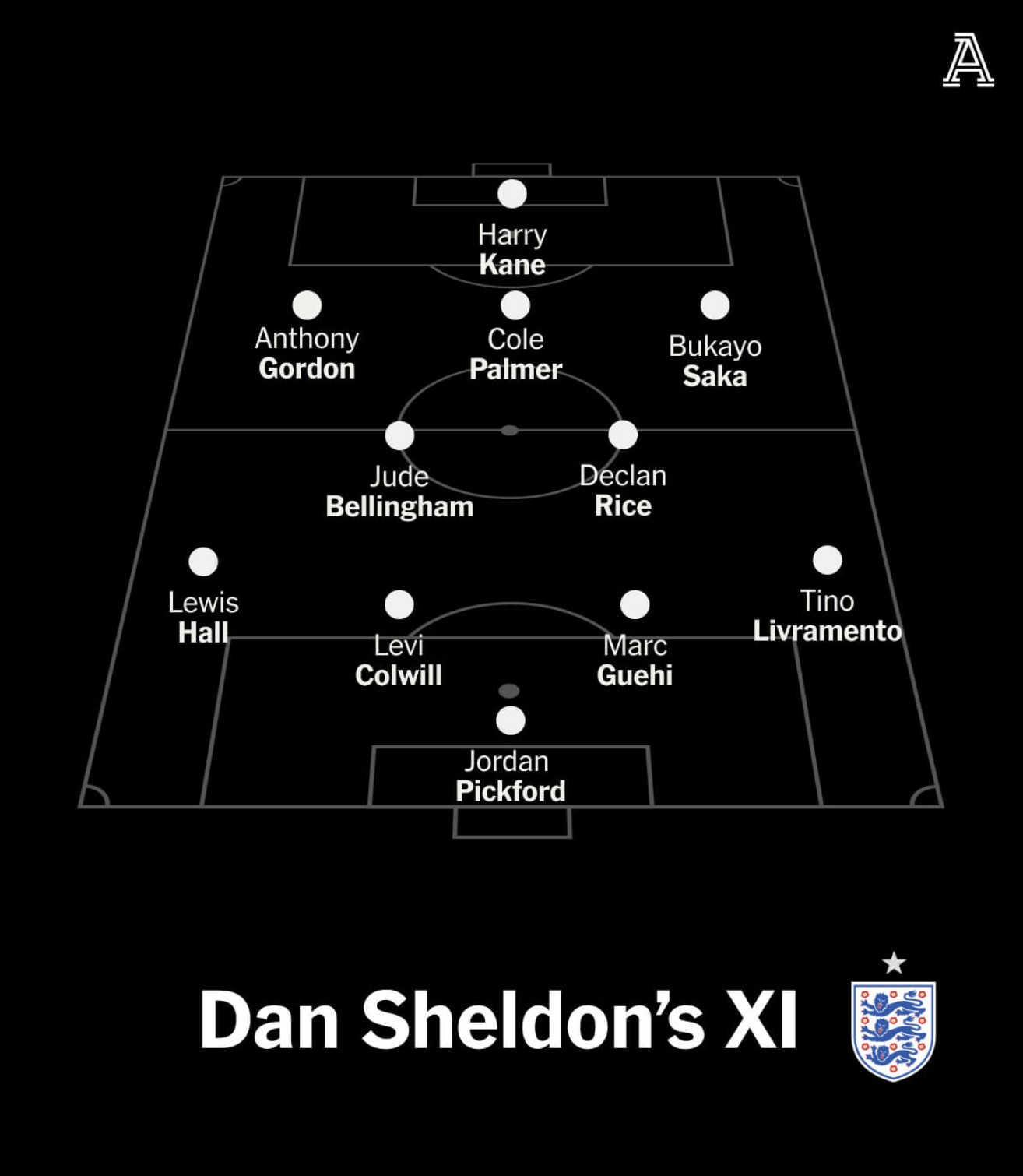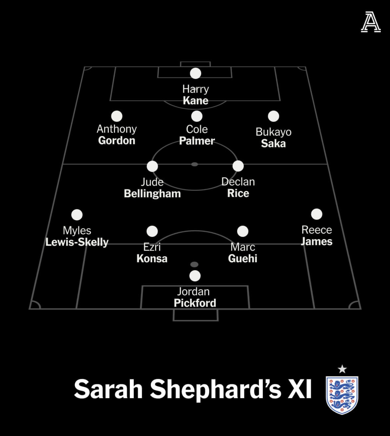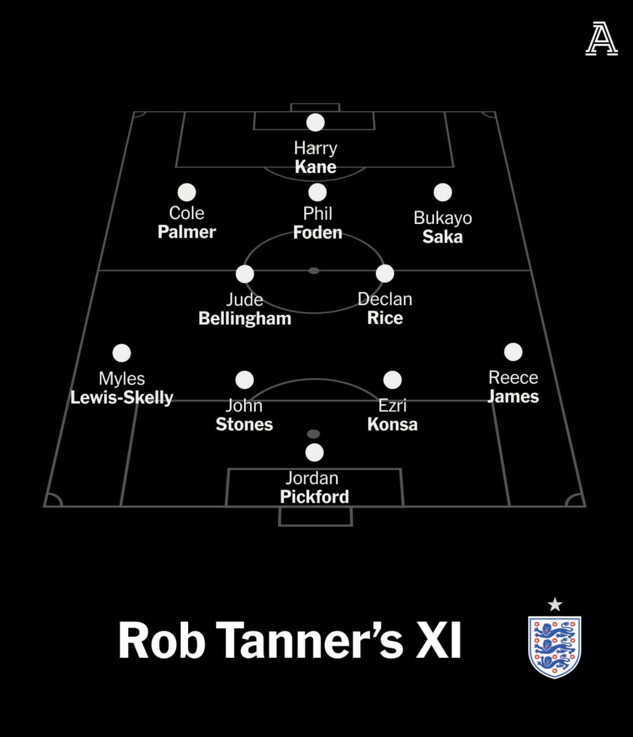 但这个首发阵容的设计初衷是将赖斯和贝林厄姆这两位成熟中场球星的作用最大化,并加入亚当-沃顿。我确实考虑过要不要将凯恩排除在外,因为他在2024年欧洲杯上的表现似乎有所下滑,但只要他下赛季依旧保持进球状态,他就会留在阵中。
