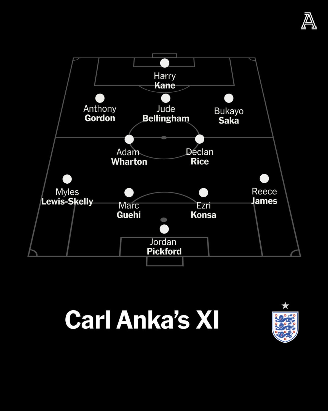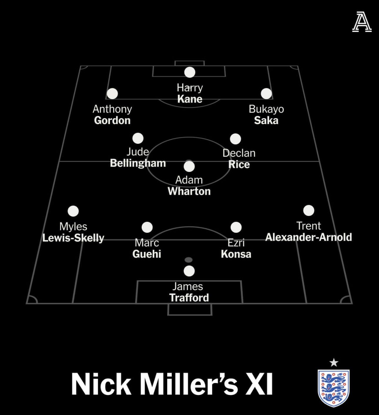 有些位置无需多言。皮克福德、赖斯、贝林厄姆、萨卡和凯恩这几位功勋球员,将是英格兰的中流砥柱,直至他们退役。安东尼-戈登担任左路,以利用速度冲破防线,并在凯恩身后进行逼抢。